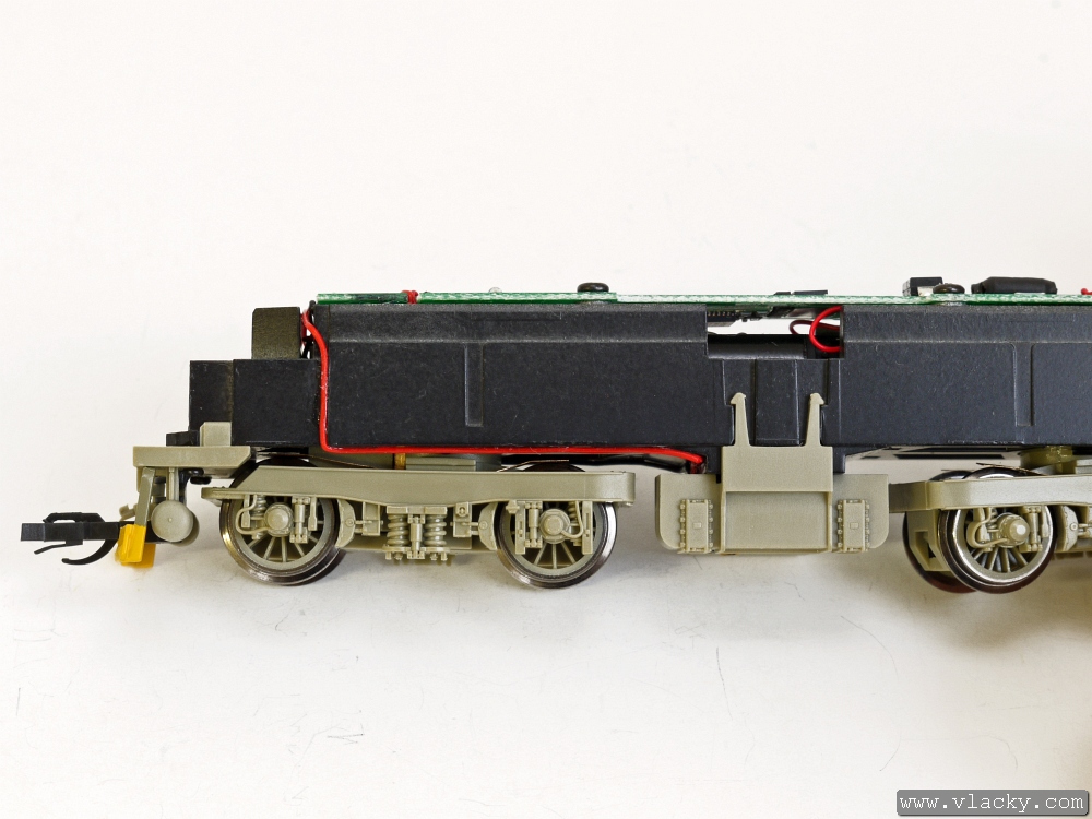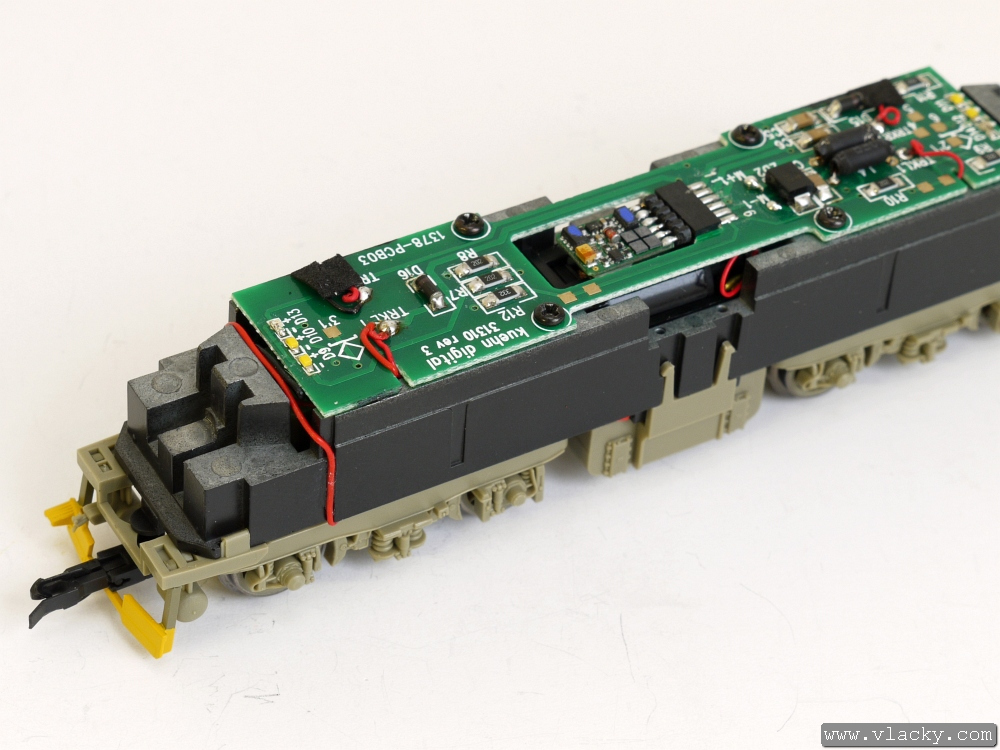 Přívodní vodiče zkrátíme a připájíme je na plošky označené TRKR-1 a TRKL-1, na které je zároveň přivedeno červenými vodiči napájení od levého podvozku. Před kompletací lokomotivu přezkoušíme a porovnáme vodiče, aby nebránily nasazení a docvaknutí skříně lokomotivy.