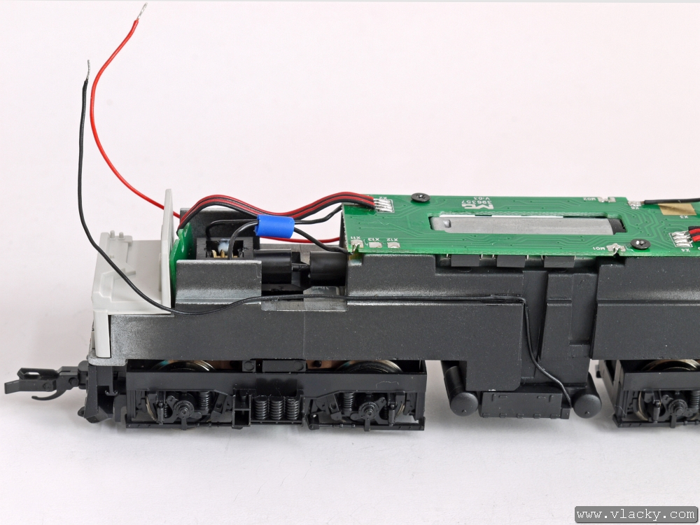 Přívody vedeme uvnitř lokomotivy až ke konci plošného spoje. Přívody jsou fixovány kapkou vteřinového lepidla.