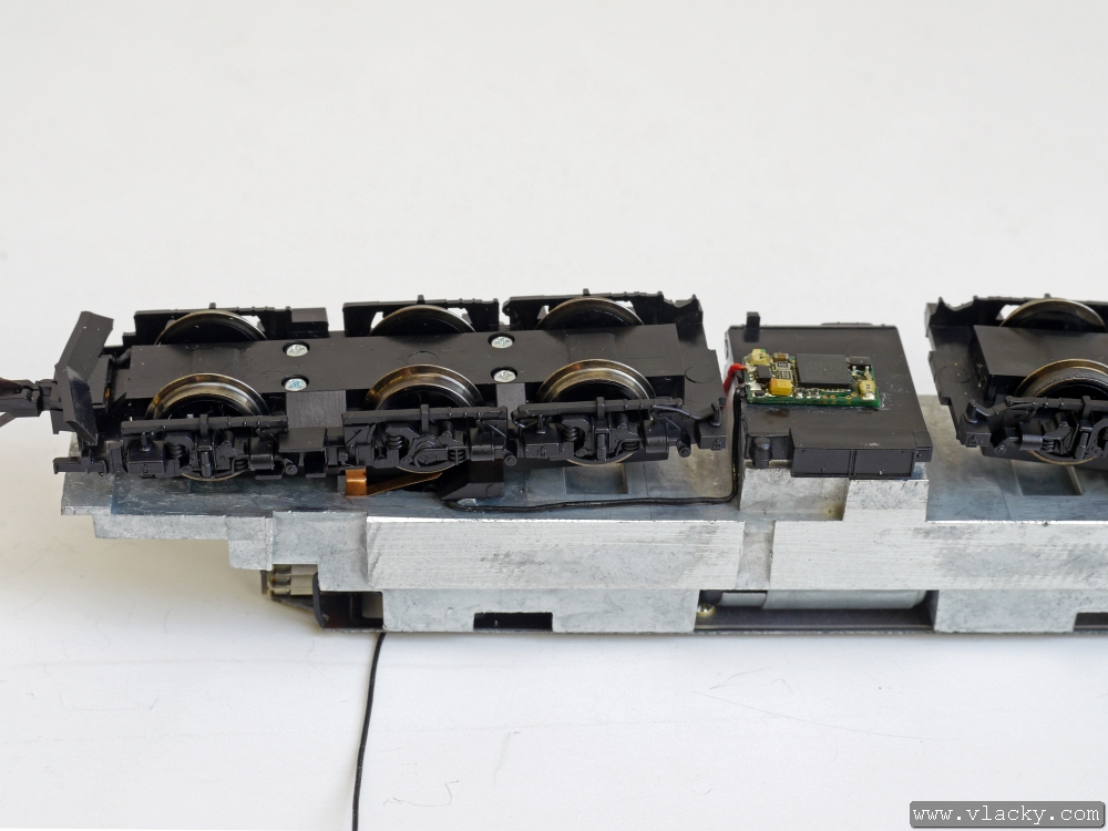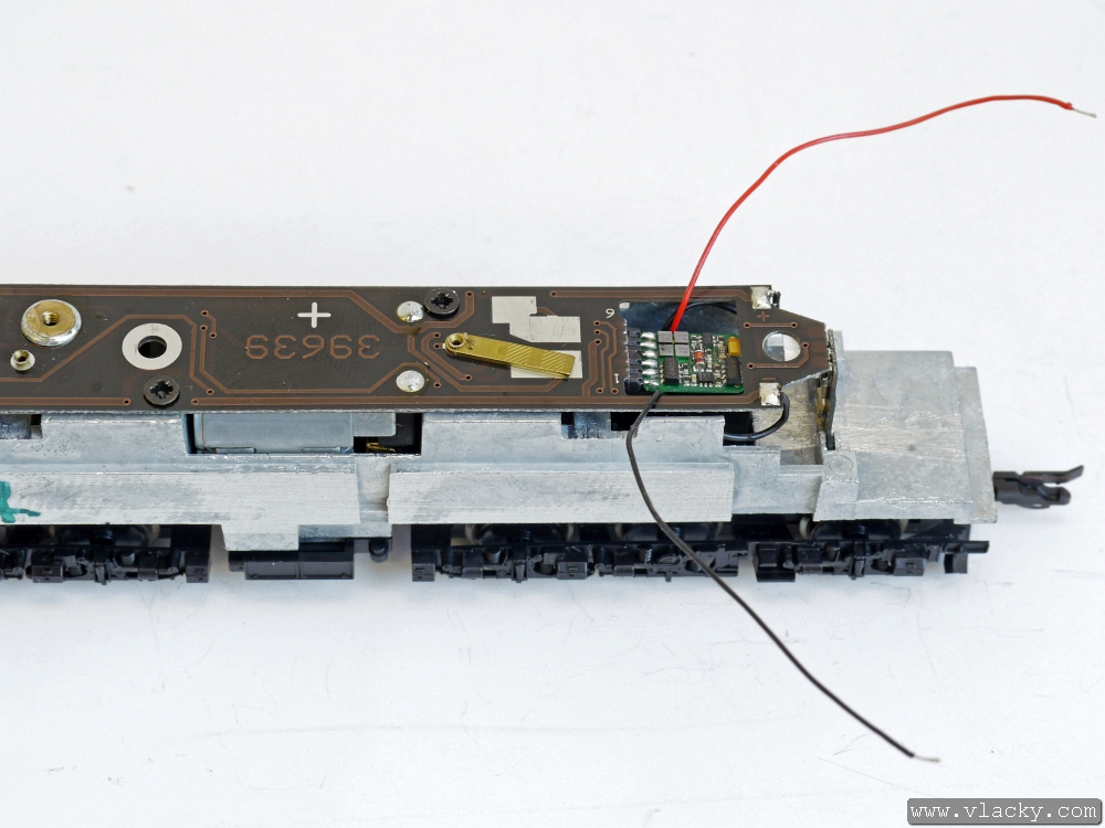 Přívody vysílače LISSY byly připájeny na plošný spoj vedle přívodů od podvozku lokomotivy. V tomto okamžiku je lokomotiva připravena k provozu.