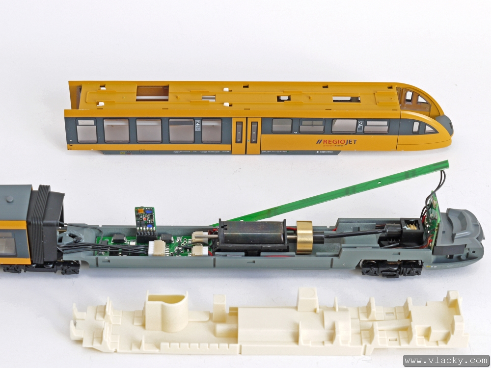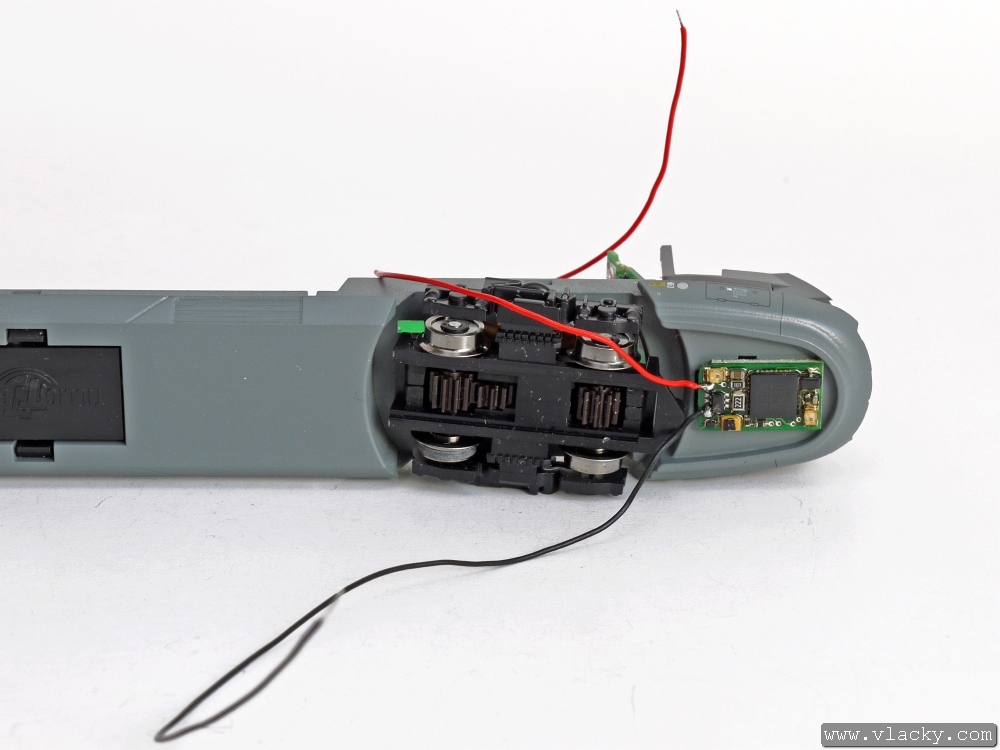 Vodiče připájíme na plošky, kde je přivedeno napájení od podvozků. Černý vodič je vlevo u měchů, červený vodič je vpravo. Před kompletací motorovou jednotku přezkoušíme a upravíme vodiče zpátky, aby nebránily zpětnému sestavení skříně.