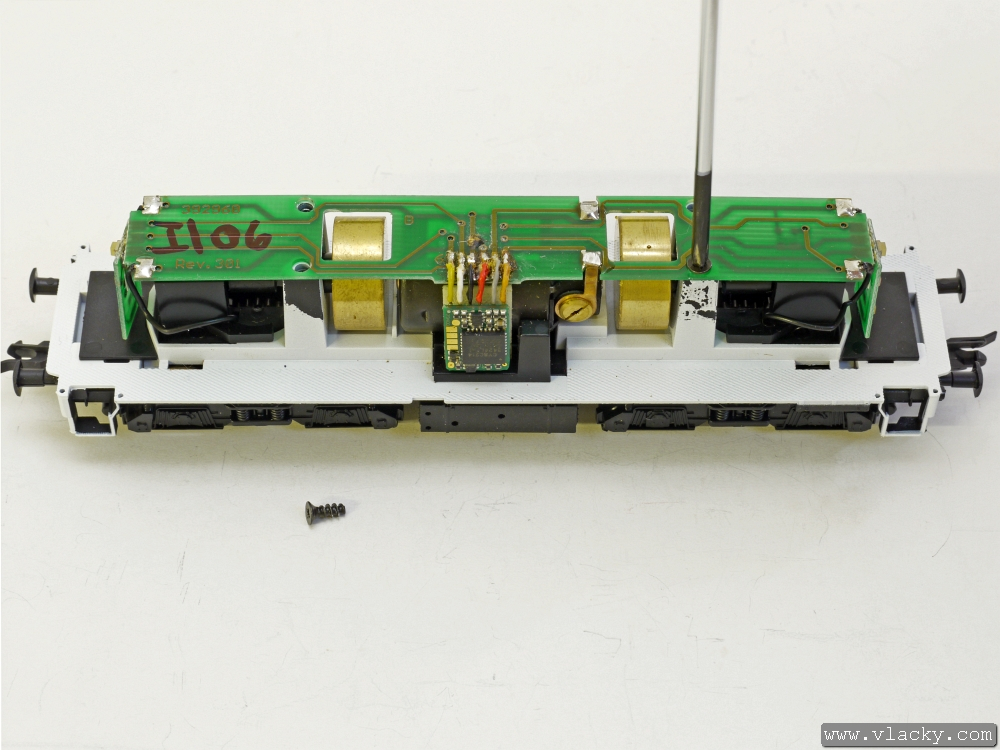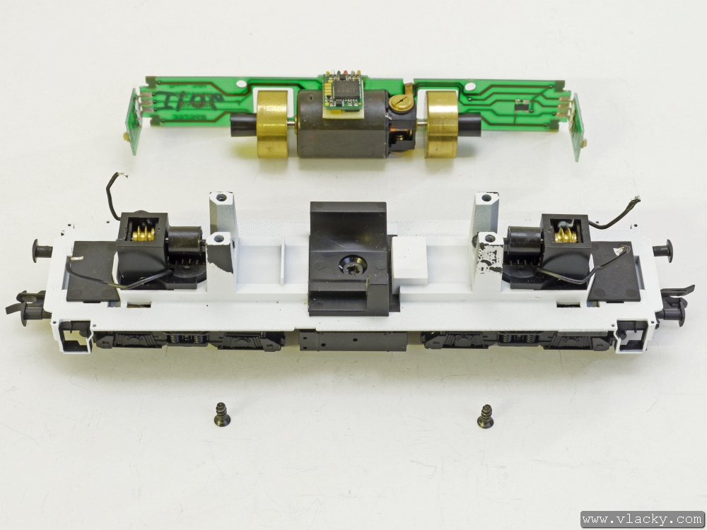 Opatrně sundáme plošný spoj včetně motorku a lokomotivního dekodéru. Během sundávání musíme ze setrvačníků vyháknout oba kardanovy hřídele. Musímě postupovat velmi opatrně, abychom plastové kardany nepoškodili.