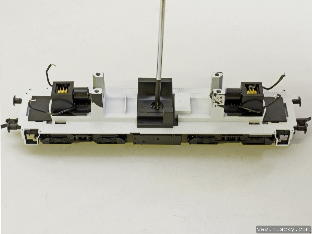 Uvolníme šroubek, který spojuje plastové uložení motorku s balastem (imitací nádrže) pod lokomotivou.