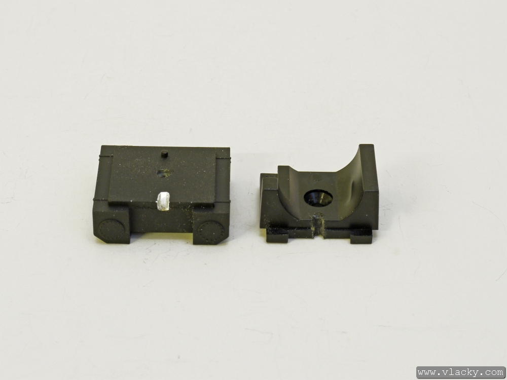 Pohled na demontovaný balast (imitaci nádrže) a plastové uložení motorku. Malý čep na balastu jako klíč brání nechtěnému stranovému otočení některého z obou dílů.