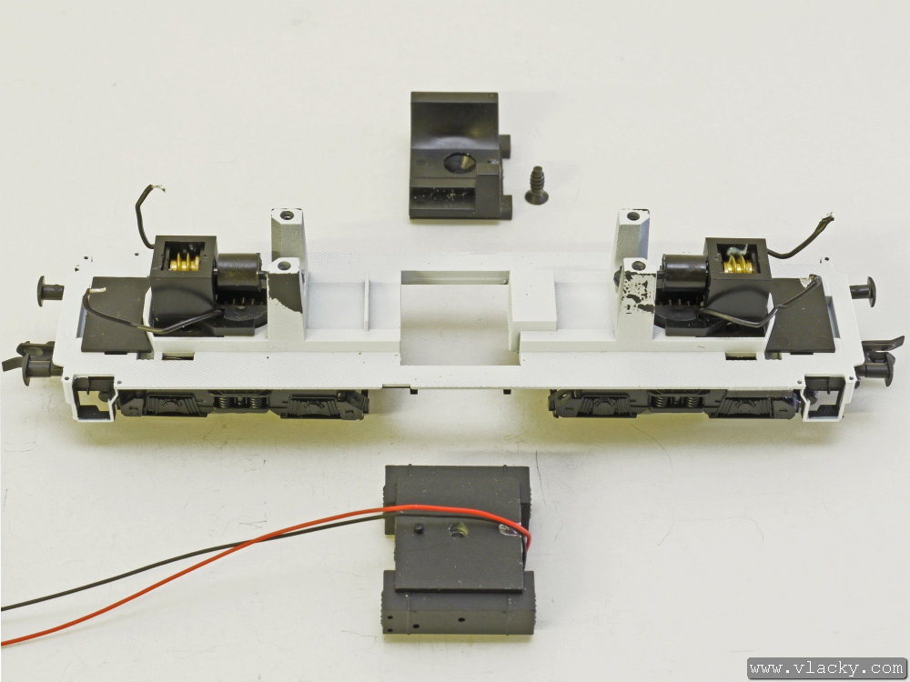 Zpátky sešroubíme dohromady plastové uložení motorku s balastem (imitaci nádrže). Připravenou drážkou dostaneme vodiče od vysílače LISSY dovnitř do lokomotivy.