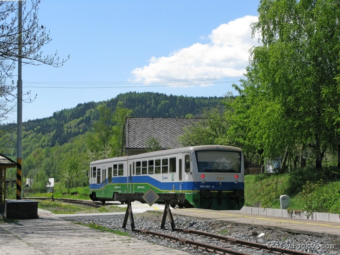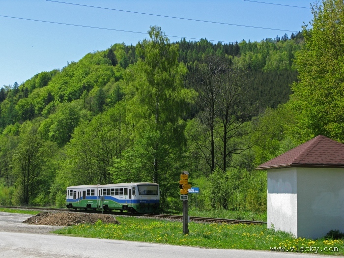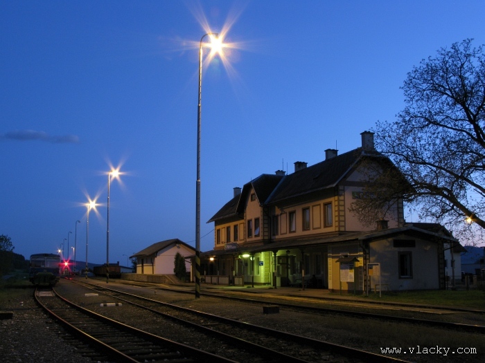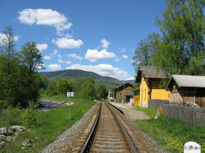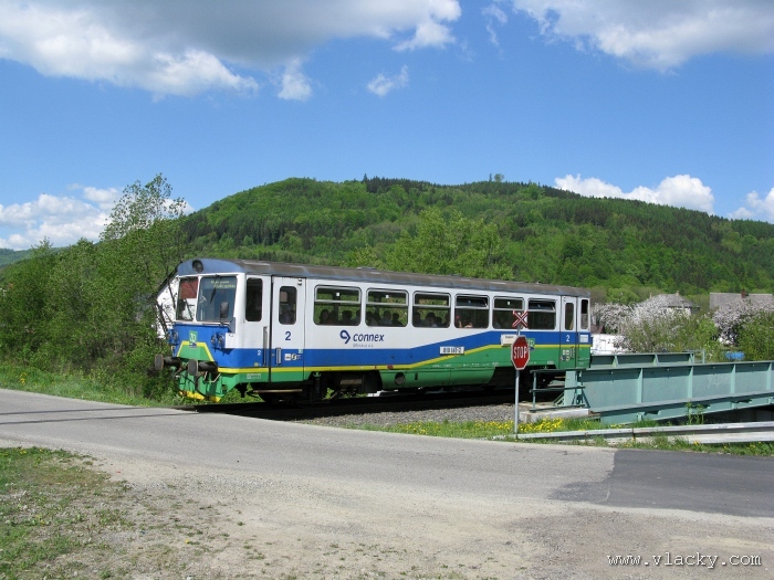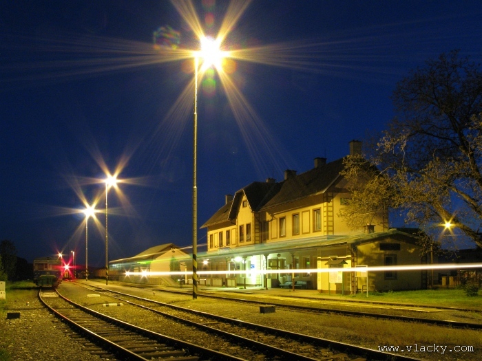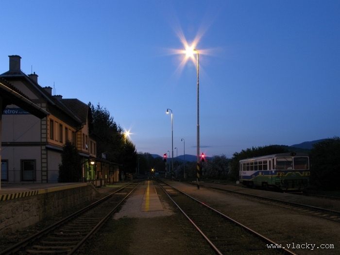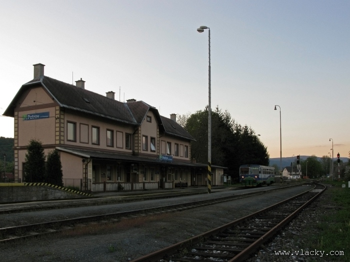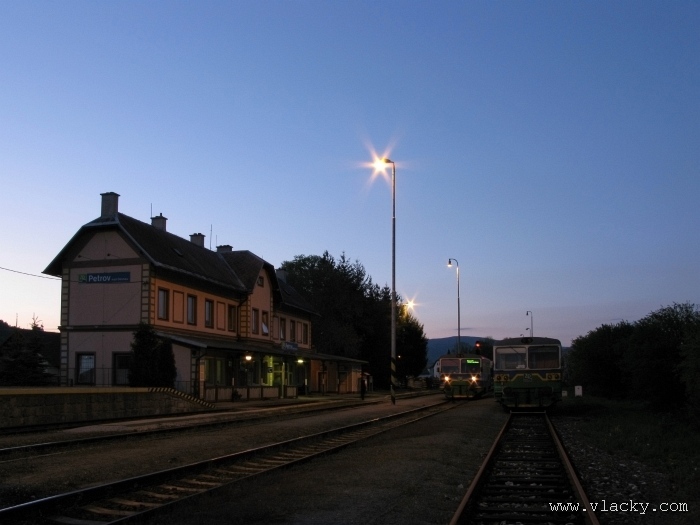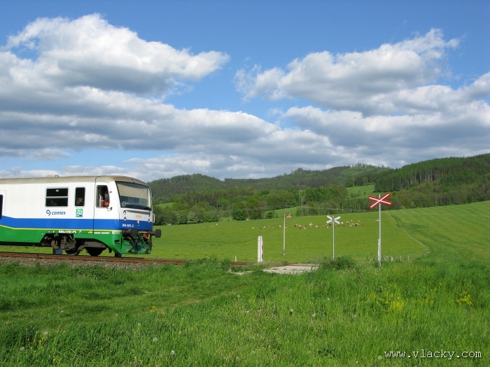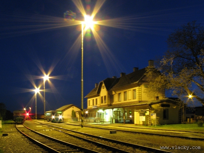 Svoji cestu jsem opět začal u trati mezi Petrovem na Desnou a Sobotínem. Ouha, nestačil jsem stativ připravit a záběr jsem pořídil z ruky. Nevadí, musím si lépe rozložit čas a tento záběr může sloužit jako referenční pro porovnání, jak vypadá takový záběr z ruky, protože následující už budou ze stativu. Přesunul jsem se na další stanoviště. Trať vede z Petrova nad Desnou mezi poli a loukami k mostu přes řeku Desná, následuje zastávka Rapotín zastávka, za ní přejezd se silnicí č. 44 spojující Šumperk s Jeseníkem a hned za ním trať pravotočivým obloukem stoupá k nedaleké zastávce Rapotín. Zde jsem počkal na průjezd Os 13763. Za pár minut za ním jede další Os 13765 z Velkých Losin do Šumperka. Na ten jsem si počkal na nástupišti nedaleké zastávky Rapotín v 11.16. Popojel jsem dále až za zastávku Loučná nad Desnou. Zde trať levotočivým obloukem hned dvakrát přetíná místní komunikaci se zabezpečenými přejezdy. Po průjezdu Os 13764 jsem stačil jsem dojet do následující zastávky Loučná nad Desnou-Rejhotice. Motorová jednotka Desná se již vracela z Koutů nad Desnou zpět jako Os 13767. Pokračoval jsem dále až na konečnou do Koutů nad Desnou, kde jsem si dopřál polední pauzu u kávy. Před vjezdem do stanice Kouty nad Desnou je opěrná zeď a nad ní vedoucí polní cesta. Odtud je hezký rozhled na vjezd do stanice Kouty nad Desnou. Samotná stanice je však bohužel skryta za stromořadím u řeky Desná. Počkal jsem na příjezd Os 13766 v 13.47 a potom jsem spěchal dále. Měl jsem vyhlédnuto další místo poblíž zastávky Loučná nad Desnou-Rejhotice. Souprava Desná se již vracela v 14.13 jako Os 13771. Na zastávce Loučná nad Desnou-Rejhotice jsem pořídil několik záběrů. Proti loňskému roku byla vlečková kolej definitivně snesena, zbytek zůstal pouze na přejezdu v místní komunikaci a za branou areálu. Další krátká zastávka byla v Loučné nad Desnou. Původní staniční budova byla ve srovnání s loňským rokem spravena a opatřena novou fasádou. Na další Os 13770 jsem počkal u přejezdu před Loučnou nad Desnou v 15.20. Jak jsem se dozvěděl později, motorový vůz pro neschopnost již dále nedojel a tato technická závada tak způsobila zpoždění i dalších vlaků. Postižen byl hned Os 13772, který jsem zastihl při zpáteční cestě na zastávce Rapotín zastávka. Vrátil jsem se zpět do Petrova nad Desnou. Os 23867 ze Sobotína nedojel, byl nahrazen autobusem. Os 13773 přijížděl do Petrova nad Desnou také se zpožděním. Protože na obrat v Šuumperku je jen 8 minut, zpožděn byl i Os 13774, na který jsem čekal v polích u vjezdového návěstidla do Petrova nad Desnou, a následující Os 13775 z Koutů nad Desnou, který v Petrově nad Desnou musel počkat na vracející se přípoj od Sobotína. Ale den ještě neskončil. Vrátil jsem se do stanice Petrov nad Desnou kolem 20. hodiny, abych zkusil ještě noční focení. Po západu slunce měnila obloha postupně svoji barvu z nevýrazných odstínů krátce po soumraku, přes krásně temně modrou až po neproniknutelnou černou. Dá se říci, že krásně temně modrá obloha pro focení vydrží tak půlhodinku. Pochopitelně na stativ jsem upevnil fotoaparát, protože expoziční časy se postupně prodlužovaly od 5s až do 15s. Na noční akce by se hodily tak stativy dva, druhý pro kameru. Poslední záběr jsem už nestačil exponovat a z odjíždějícího Os 13782 zůstaly jen obrysy a stopy po reflektorech.