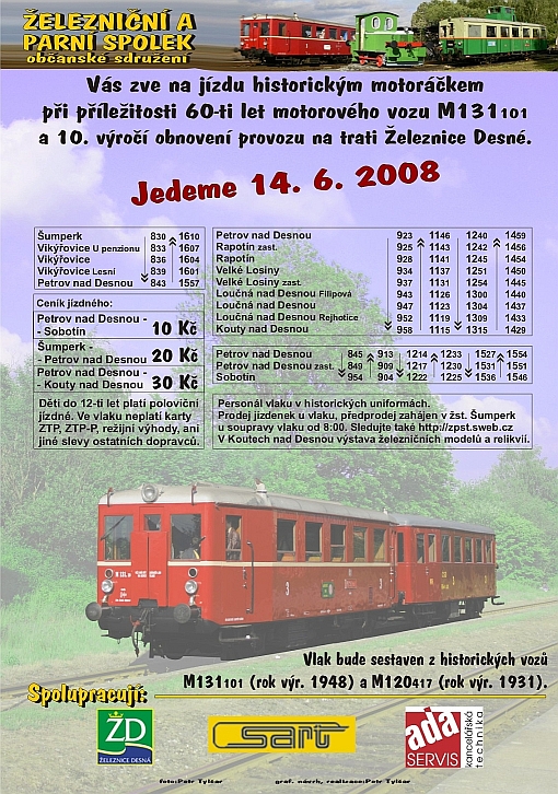 Železnice Desná   V rámci letošních oslav 10. výročí obnovení provozu na trati 293 po povodni v roce 1997 připravil Železniční a parní spolek Troubelice (ŽPST) mimořádné vlaky na sobotní den. Vlak byl sestaven z motorového vozu M131.101 "Hurvínek" (rok výroby 1948) a jako vlečný vůz byl použit M120.417 "Věžák" (rok výroby 1931). Podle vydaného jízdního řádu zvláštních vlaků se měly uskutečnit 3 jízdy do Sobotína a 2 jízdy do Koutů nad Desnou.