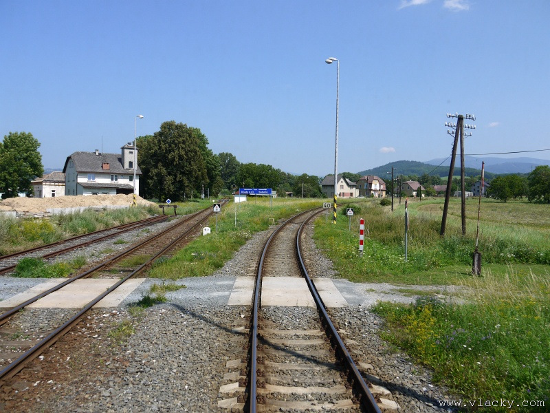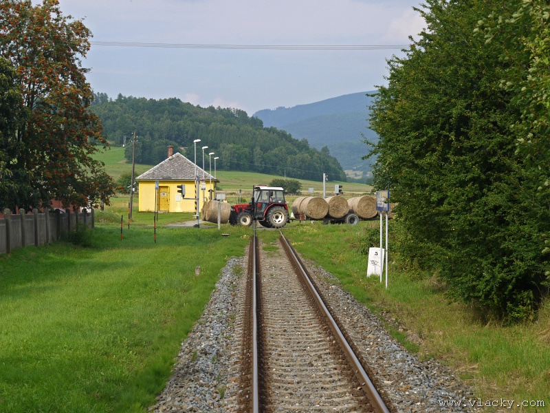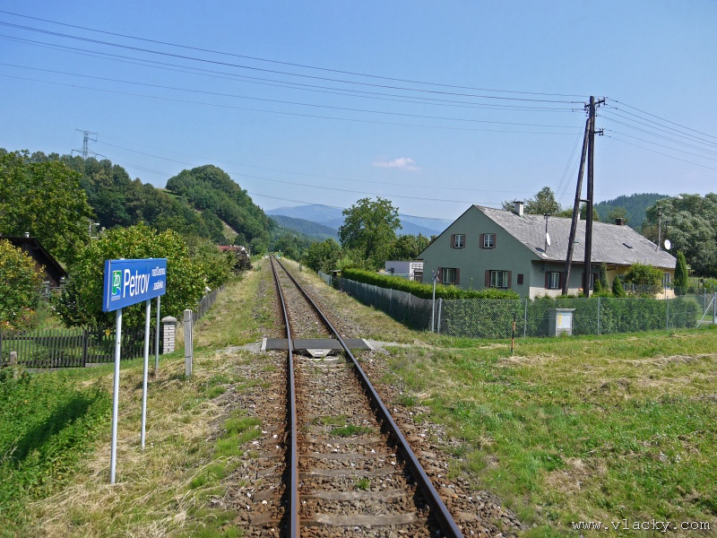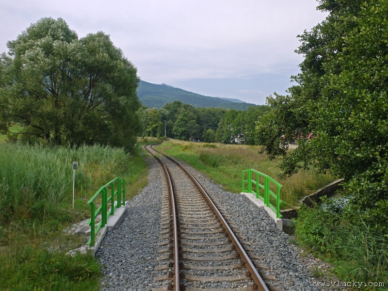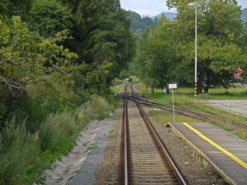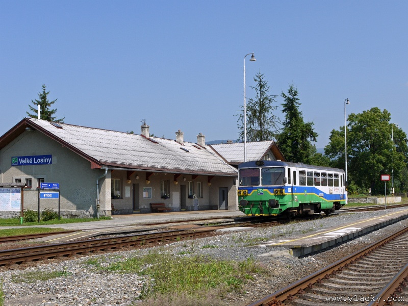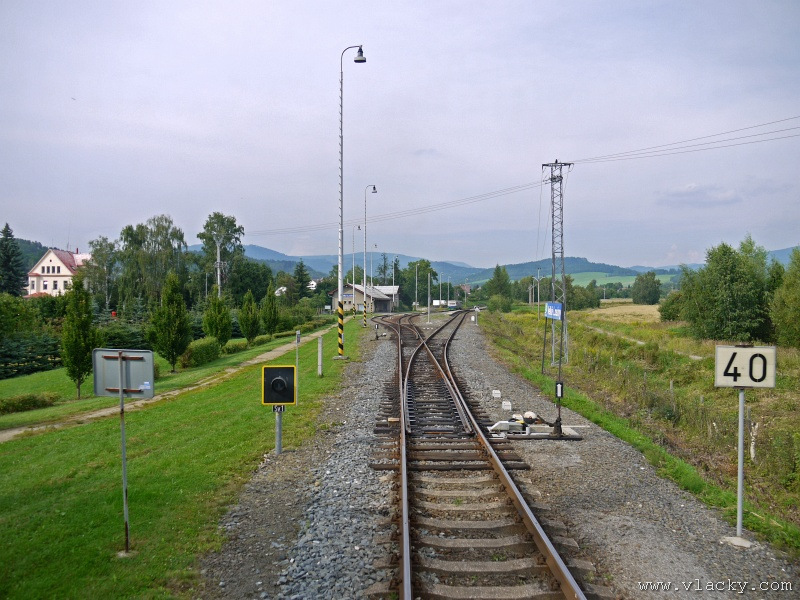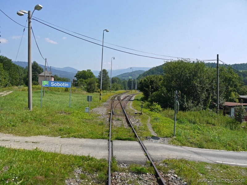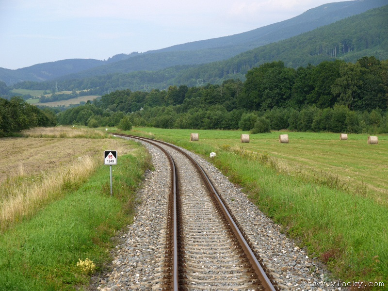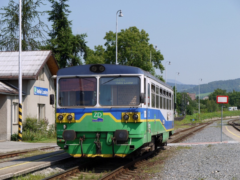Motorový vůz 810 141-2 "Ježek" před polednem stál ve stanici Velké Losiny, kam přijel jako Os13762. Před polednem se jako Os13765 vrátil v 11.48 do stanice Petrov nad Desnou, aby hned točil na další výkon jako Os23858 do Sobotína s odjezdem v 11.53. Než jsem odjeli ze stanice, po naší levici nás předjela jednotka "Desná" jako Os13764 jedoucí do cílové stanice Kouty nad Desnou. Po výjezdu z Petrova nad Desnou se trať okamžitě stáčí pravým obloukem k hlavní silnici č. 11 na Ostravu. Jízda nebude nijak dlouhá, protože trať do Sobotína měří nějaké 3km a to je před námi ještě Petrov nad Desnou zastávka. Blížíme se k přejezdu se silnicí č. 11, kde je zároveň zmíněná zastávka. Teď v poledne je vytíženost spoje minimální, nikdo nevystupuje, nemáme zpoždění a nezastavujeme. Přejíždíme po ocelovém mostě, kde pod námi je místní komunikace spojující Rapotín s Petrovem nad Desnou a říčka Merta. Trať více stoupá a klikatí se mezi stromy na úpatí svahu. Netrvá dlouho a přijíždíme do stanice Sobotín. Po naší pravici je viditelná zástavba kolem silnice č. 11, ale jedná se o obec Petrov nad Desnou. Obec Sobotín začíná až za stanicí. Zastavujeme před staniční budovou, ale koleje pokračují ještě dále dozadu k rampě. Zde je manipulační sklad firmy Desná a.s., která se v tomto areálu zabývá zpracováním a prodejem surového dřeva, řeziva a paliva. V týdnu je zde často nakládáno i více vozů dřevem a celkem pravidelně je možné vidět nákladní manipulační vlak Mn83454, který v 7.35 naváží prázdné vozy do Sobotína, a jako Mn83455 je v 8.30 vozí zpět. Časy odjezdu jsou podle grafikonu, ale jsou orientační a vlak jede jen v případě potřeby. Po několikaminutovém pobytu ve stanici Sobotín odjíždíme v 12.03 jako přímý Os23859 do stanice Šumperk. V odpoledních hodinách se pravidelným spojem Os23865 dopravuji v 15.31 do Šumperka. Motorový vůz 810 141-2 "Ježek" pojede jako Os23866/Os13772 do Koutů nad Desnou. Do odjezdu v 15.39 zbývá pár minut na přípravu a nějaké to dokumentační foto u nástupiště. Přiblížil se čas pravidelného odjezdu a výpravčí nám dává návěst rozkaz k odjezdu. Opouštíme elektrifikovanou stanici Šumperk a podle jízdního řádu zdoláváme první kilometry trati. Nebudu zde popisovat trať do Koutů nad Desnou. Průběh jízdy jsem okomentoval v minulých letech. Poukázal bych na nejviditelnější úpravy trati v úseku Petrov nad Desnou - Rapotín zastávka. Zde v levém oblouku byly zde provedeny větší zemní úpravy zářezu s novým odvodněním. Zářez byl také snížen odvozem přebytečné zeminy a rozšířen. Ve Velkých Losinách se strojvedoucí ohlašuje výpravčímu do Petrova na Desnou. Musíme také počkat na příjezd Os13773 z Koutů nad Desnou, se kterým se zde křižujeme. Bezoblužnost křižování zajišťují výhybky se samovratnými přestavníky na obou zhlavích stanice. Při odjezdu z Velkých Losin je dobře vidět, že výhybka je přestavena v základní poloze do odbočky a kola našeho motorového vozu ji přehodí do přímého směru. V horní části trati je místy viditelné agresivní prorůstání zeleně v tělese trati. Ani pravidelné postřiky trati proti plevelu nemohou vegetaci zadržet. Navíc od Loučné nad Desnou-Rejhotice je trať více schována v lesním porostu. Řešením je tak pravidelné prořezávání náletových dřevin a odstraňování vegetace v blízkosti koleje. Takové prořezání svahu je vidět před lichoběžníkovou tabulkou na vjezdu do stanice Kouty nad Desnou. Ve stanici Kouty na Desnou bývají odstaveny přívěsné vozy. Tentokrát neušly vandalismu příznivců graffiti. Jeden přívěsný vůz je zrovna na obnově laku a druhý na opravu čeká na konci odstavné koleje. Ve stanici Kouty nad Desnou a při zpáteční cestě v Os13775 jsem pořídil několik dokumentačních záběrů a v 16.57 jsem vystoupil v Petrově nad Desnou. Další informační zdroje: